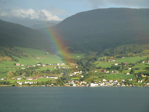 Die Ausfahrt aus dem Fjord war erst für abends um 19 Uhr anberaumt. Nachdem wir dann im Fjord durch eine Regenwolke durchgefahren waren, wurden wir auch hier mit einem Regenbogen belohnt.